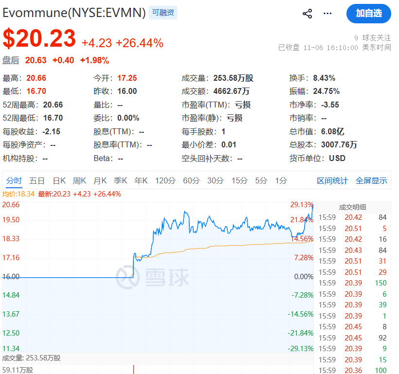 当地时间11月6日,Evommune、BillionToOne、Grupo Aeroméxico同日登陆美股上市,共募集资金6.46亿美元,平均每家募资约2.15亿美元。 3只新股上市首日集体大涨,其中涨幅最高的当属BillionToOne,该股首日收涨81.57%。 1、Evommune(EVMN) 首日开盘,Evommune每股报17.25美元,较发行价上涨7.25%。盘中高开高走,...
