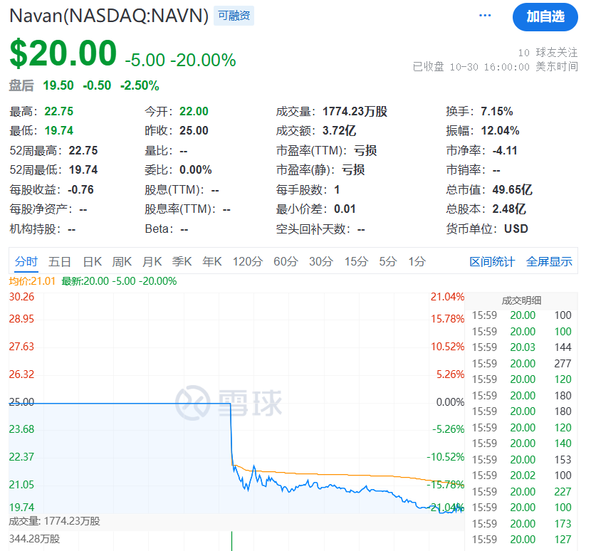 当地时间10月30日,企业差旅软件提供商Navan与SPACDynamixCorporationIII 同日在纳斯达克上市,2只新股共募集资金约11亿美元。 1、Navan(NAVN) 首日开盘,Navan每股报22美元,较发行价下跌12%。盘中低开低走,至收盘每股报20美元,跌幅20%,总市值49.65亿美元。 该公司此次发行价为每股25美元,发行了3692万股,募集资金9.23亿美元...